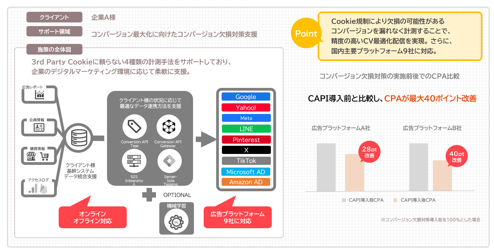 実際、この対策を導入したことでCPA(顧客獲得単価)が下がったという事例も見られます。特に獲得系商材を扱うクライアント様には、ぜひ導入していただきたい重要なソリューションだといえるでしょう。